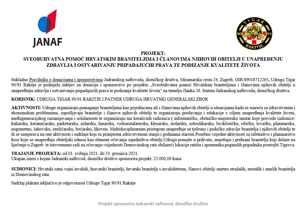 Sukladno Pravilniku o donacijama i sponzorstvima Jadranskog naftovoda, dioničkog društva, Miramarska cesta 24, Zagreb, OIB:89018712265, Udruga Tigar 90/91 Rakitje je podnijela zahtjev za donaciju i sponzorstvo po projektu „Sveobuhvatna pomoć Hrvatskim braniteljima i članovima njihovih obitelji u unapređenju zdravlja i ostvarivanju pripadajućih prava te podizanje kvalitete života“ na temelju članka 26. Statuta Jadranskog naftovoda, dioničkog društva.