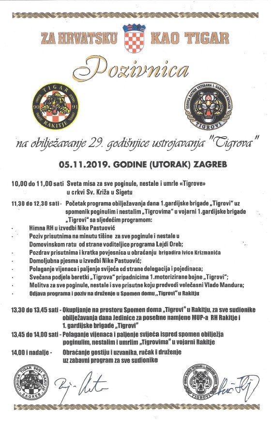 Pozivamo sve Tigrove, članove obitelji i ostale građane na obilježavanje 29. godišnjice ustrojavanja Tigrova, koje će se održati u utorak, 5. studenog 2019. prema sljedećem programu: